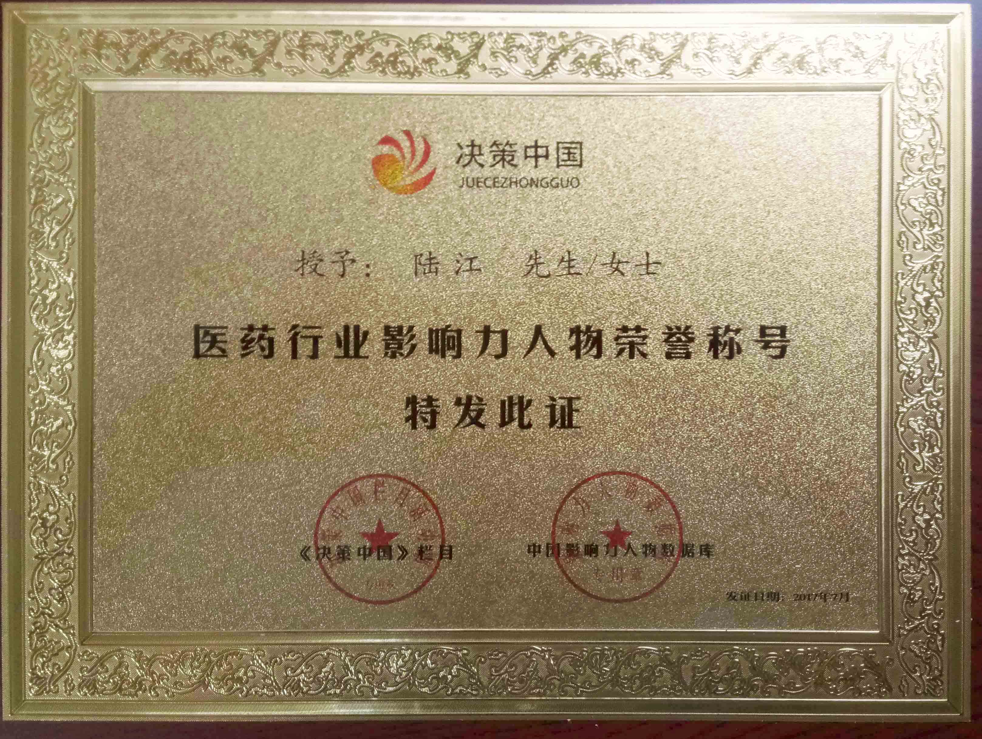 陸江榮獲醫(yī)藥行業(yè)影響人物證書